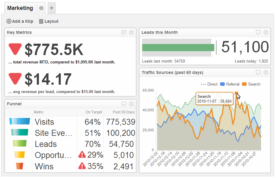 Start at the bottom of the marketing funnel before you work your way up. Our lead conversion dashboards tie marketing analytics to sales analytics, allowing you to see what your ROI is filterable by marketing campaign, source/channel, etc. You can also see lifetime value of customers and what process they take when they come back. Access to this information can be a powerful tool because you can better understand their time of need and preferred communication channels, allowing you to pre-build automated messages to the end user or their sales representative.